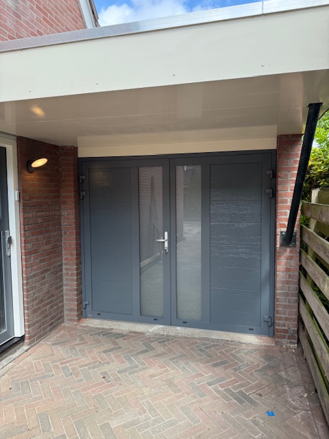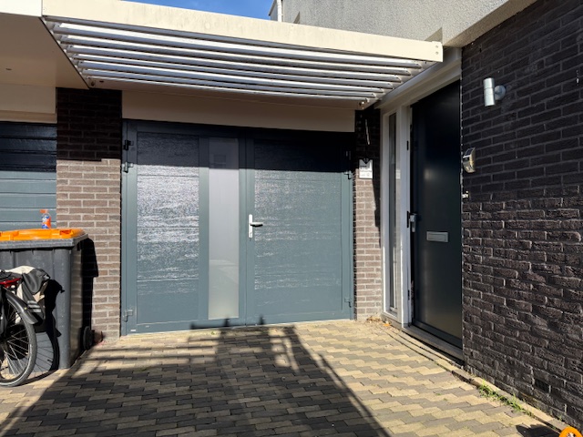 De openslaande garagedeur met glas wordt voorzien van HR++ beglazing.
